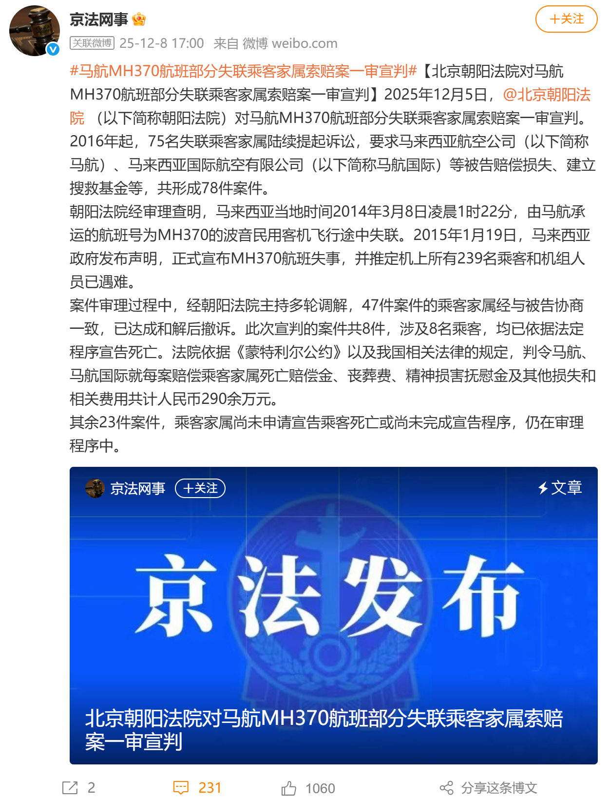 北京市法院對馬航MH370航班部分失聯乘客家屬索賠案一審宣判