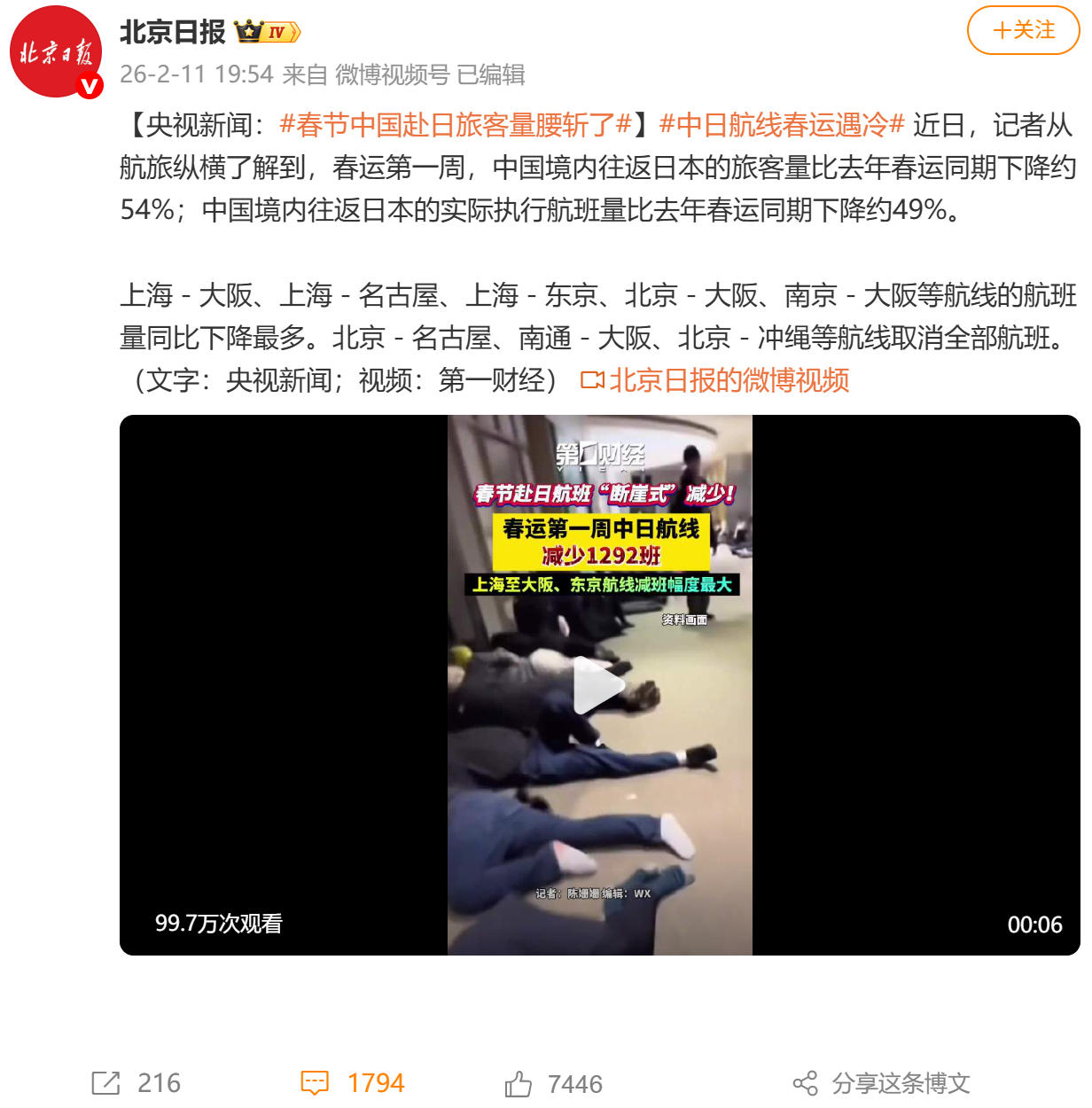 日本首相高市早苗2025年11月發表「台灣有事論」後,中日關係急劇惡化,中國外交部其後建議中國公民避免前往日本旅行。關西機場2月9日公布,1月往返關西機場的中國旅客人數為27.7萬人次,較去年同期下降58%。這個數字比2025年12月的跌幅39%進一步擴大。此外,來自港澳航班的旅客人數亦比去年同期下跌12%。與此同時,包括飛往韓國、台灣和東南亞在內的其他航線的旅客人數則有所增加。韓國航班的旅客增長21%,達75.4萬人,台灣航班旅客增長10%,達26.9萬人。歐美航班旅客也保持1成左右的增長。