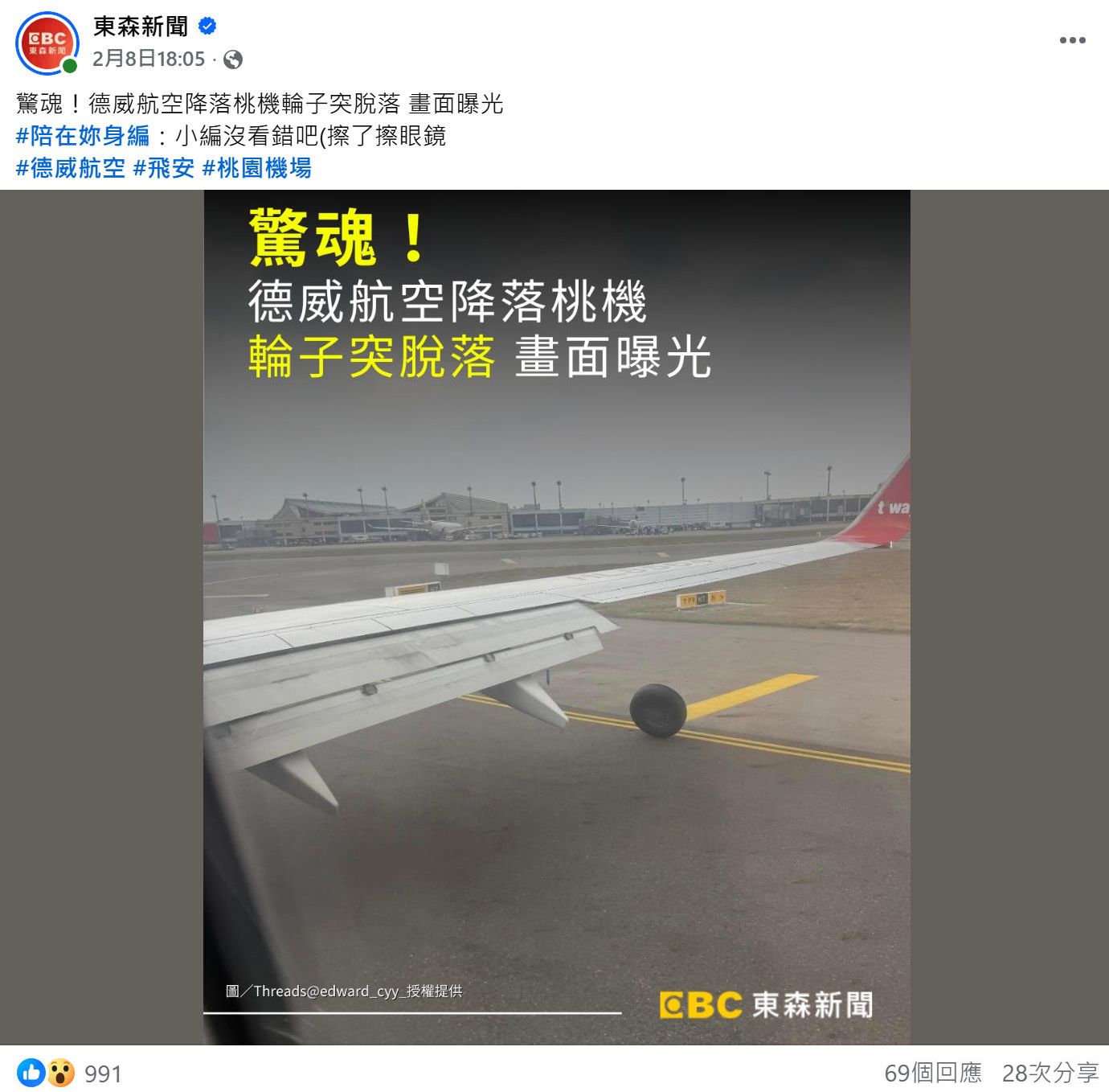 台灣桃園機場有客機降落時輪胎掉落,導致跑道要關閉,期間有三架客機因燃油不足,而發出求救訊號。涉事的德威航空客機,剛過去周日下午由南韓濟州飛往桃園機場,在北跑道準備降落時,右側的主輪胎脫落,導致跑道一度要關閉,導致至少14班航班延誤。台灣傳媒報道,事故導致兩架長榮航空,及一架香港航空客機,因要長時間在空中盤旋,導致燃油不足,而發出求救訊號,三架客機最終安全降落。不過,台灣的運輸安全調查委員會稱,由於三個航班降落時,機上的燃油量都高於最低備用油案,所以不會立案調查。