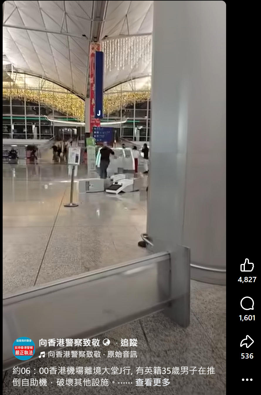 警方今晨近6時接獲報案,指香港國際機場有一名外籍男子毀壞上址物品,警方到場拘捕涉事男子。經初步調查,他涉嫌「刑事毀壞」及「管有第一部毒藥」。網上流傳一段短片,見到一名外籍男子在機場離境大堂位置狂性大發,接連推倒多台智能登記櫃檯,之後再拿起旁邊的排隊柱,猛砸智能櫃檯。