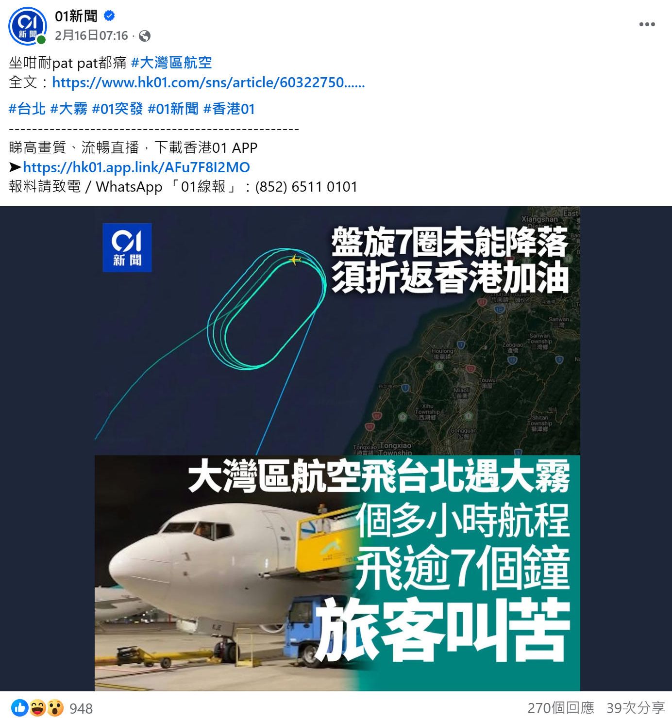 大灣區航空一班原訂昨晚由香港飛往台北的航班,由於桃園國際機場附近大霧,能見度一度只得300米,航機只能在新竹外海盤旋苦候天氣好轉。惟當盤旋約7個圈後,航機油量已不足支撐等候時間,只能折返香港入油。此航程已花約4個多小時,再加上入油及其他作業時間,該航班於今日凌晨再次啟航,最終逾7個多小時始飛抵台北。至於返程的HB707航班,亦因而順延至今日凌晨始返港。