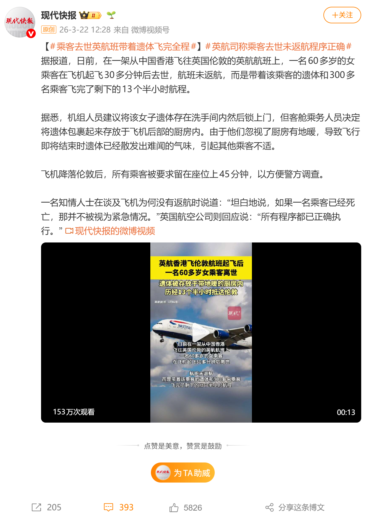 據英國《太陽報》報道,3月15日英國航空一架由香港飛往倫敦希斯路機場的航班,有一名60多歲女乘客在起飛後不久離世,但機長決定繼續原定航程而不折返香港,遺體被安置在機尾位置。接近降落時,有乘客投訴機尾傳出惡臭。據報道,該航班編號BA32,當日載有超過330名乘客從香港國際機場出發。該女乘客在起飛約一小時後離世。消息人士表示,雖然死者同行家屬及機組人員均感到極度悲痛,但由於事件不屬緊急情況,機長選擇繼續原定航程。機組人員討論遺體處理方式時,機長曾建議將遺體置於廁所內並鎖門,但遭拒絕。最終,他們用材料包裹遺體,移至機尾設有加熱地板的廚房區域安置。據報,航班飛行約13.5小時後,部分乘客投訴機尾位置散發惡臭。飛機最終安全降落希斯路機場,警方登機調查,所有乘客需留在座位上約45分鐘後才獲准離開。機組人員其後獲得公司支援,但多名員工因受驚而休假。