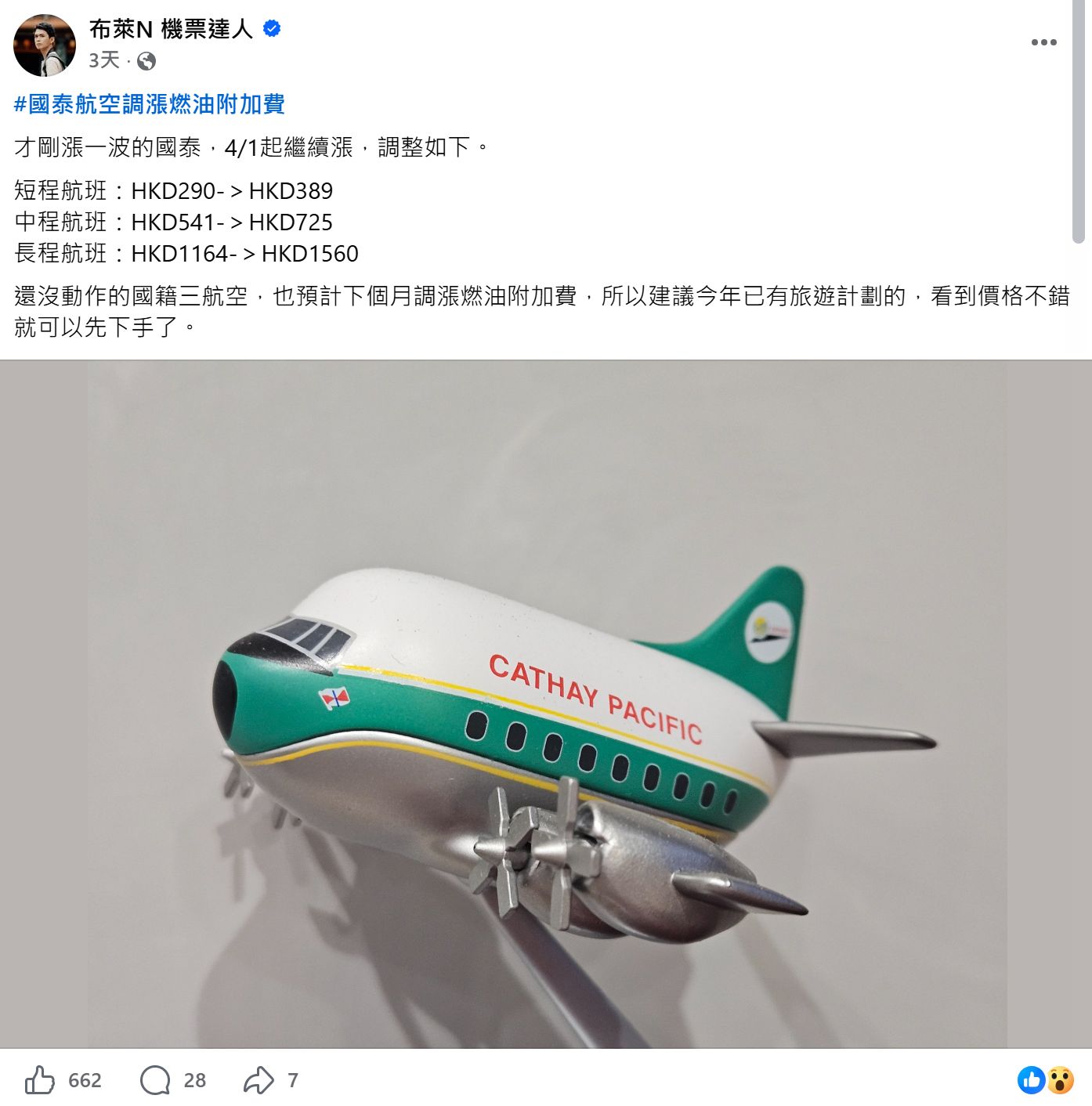 伊朗戰爭不斷,令油價高居不下,徘徊每桶100美元關口,國泰航空26日宣布,再次調整燃油附加費,以應對燃油價格飆升,升幅為34%,將於4月1日起生效。與此同時,為更靈活應對航空燃油價格的急劇變化,燃油附加費將改為每兩周檢視一次,以更有效反映航空燃油價格上升或下跌的變化。國泰表示,是次增加檢視密度為暫時措施,待中東局勢穩定後,將再次檢討有關做法。國泰指,燃油成本於2025年佔國泰航空總成本約三成,對營運至關重要。若未能有效管理持續上升的燃油成本,將難以維持航班網絡的有效運作。「一如不少航空公司,國泰採用燃油對沖以管理燃油價格的波動。然而,我們在2026年的燃油對沖僅覆蓋大約三成原油部分,而煉油部分並不在對沖範圍內,不足以抵消近期航空燃油價格急劇飆升的影響。」
