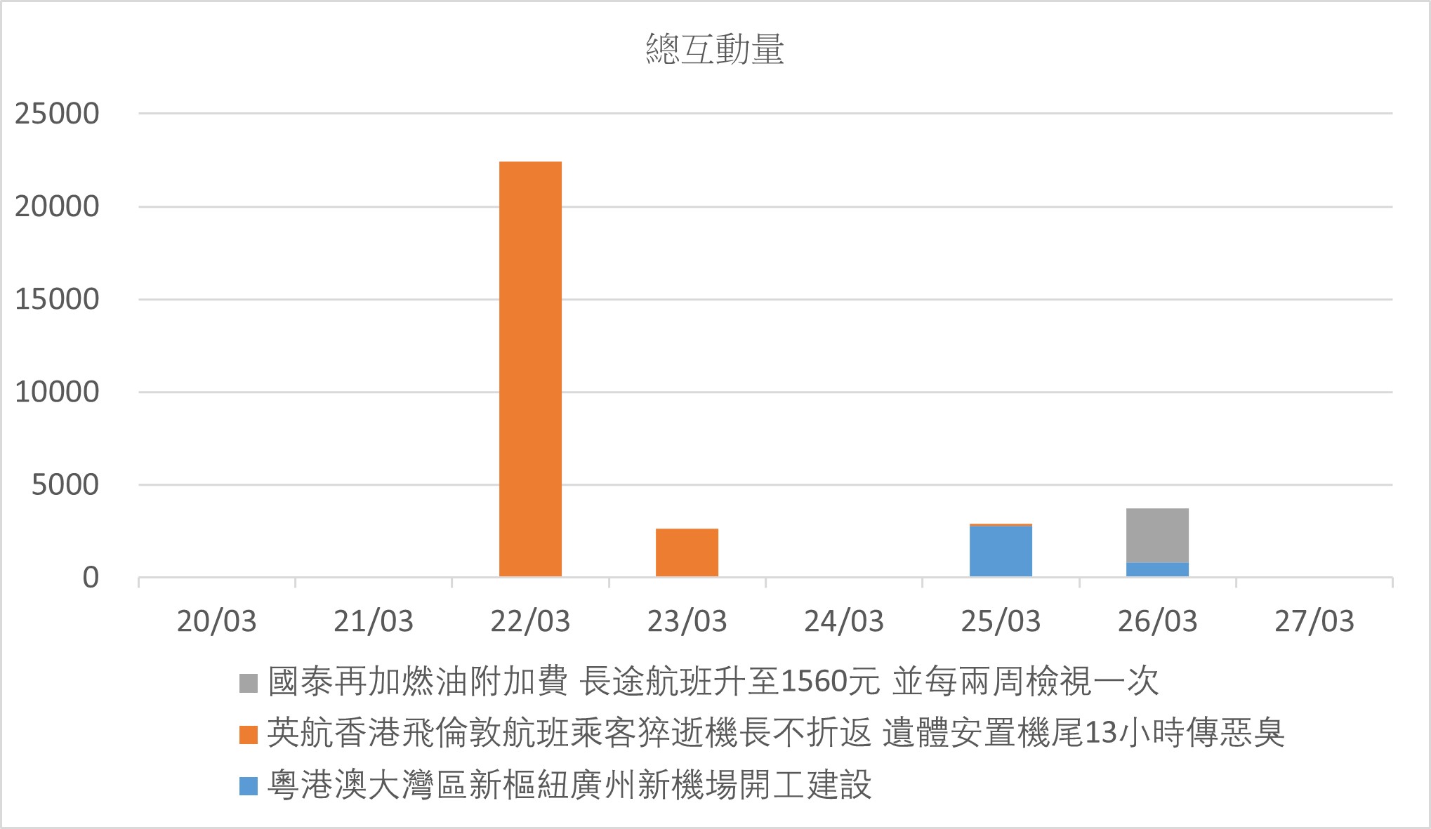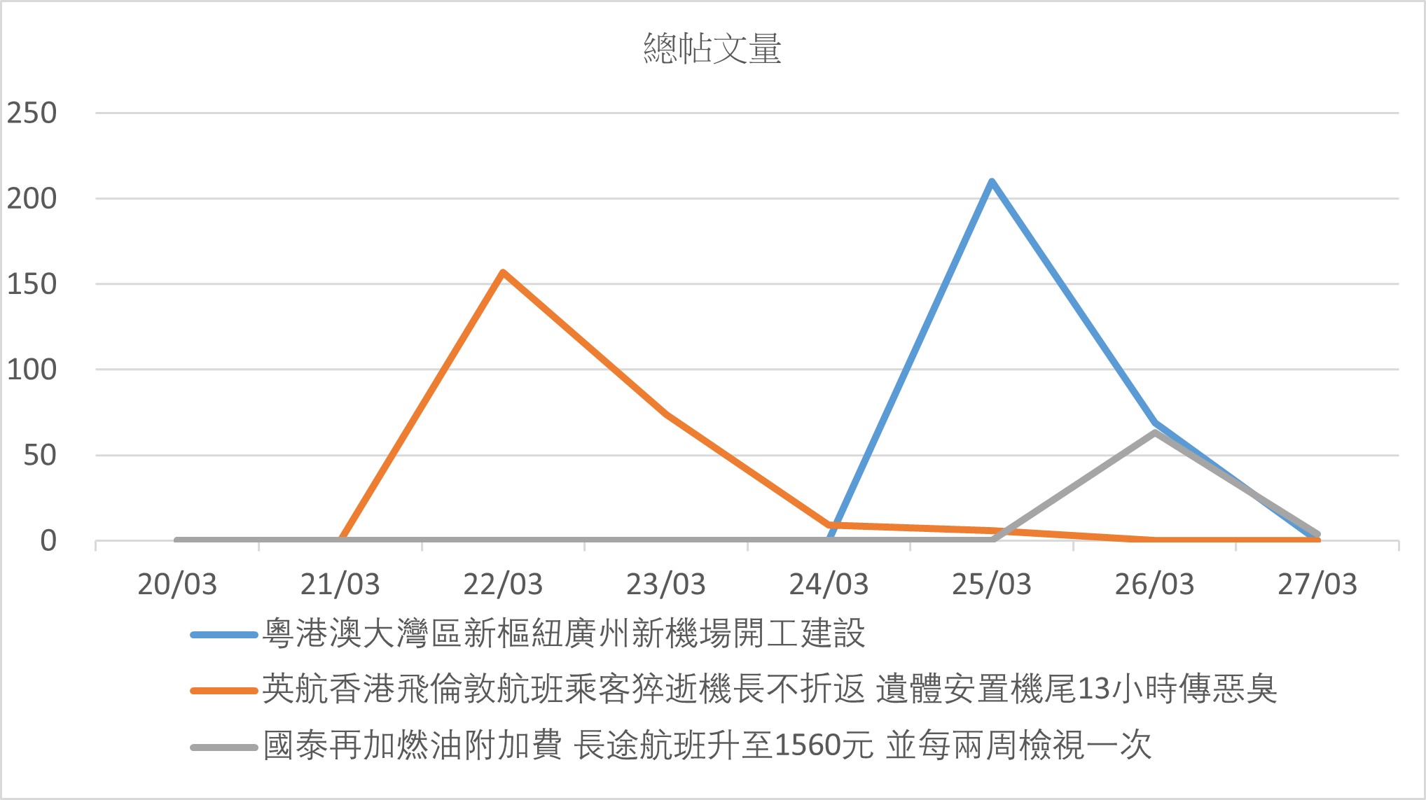 事件於25日開始錄得帖文量,並於當日引起網民及媒體的注意。其帖文量為整個星期的最高峰。帖文主要轉載於微博,為內地網民所報導和討論。有網民認為新機場的客流量不會如期的理想。